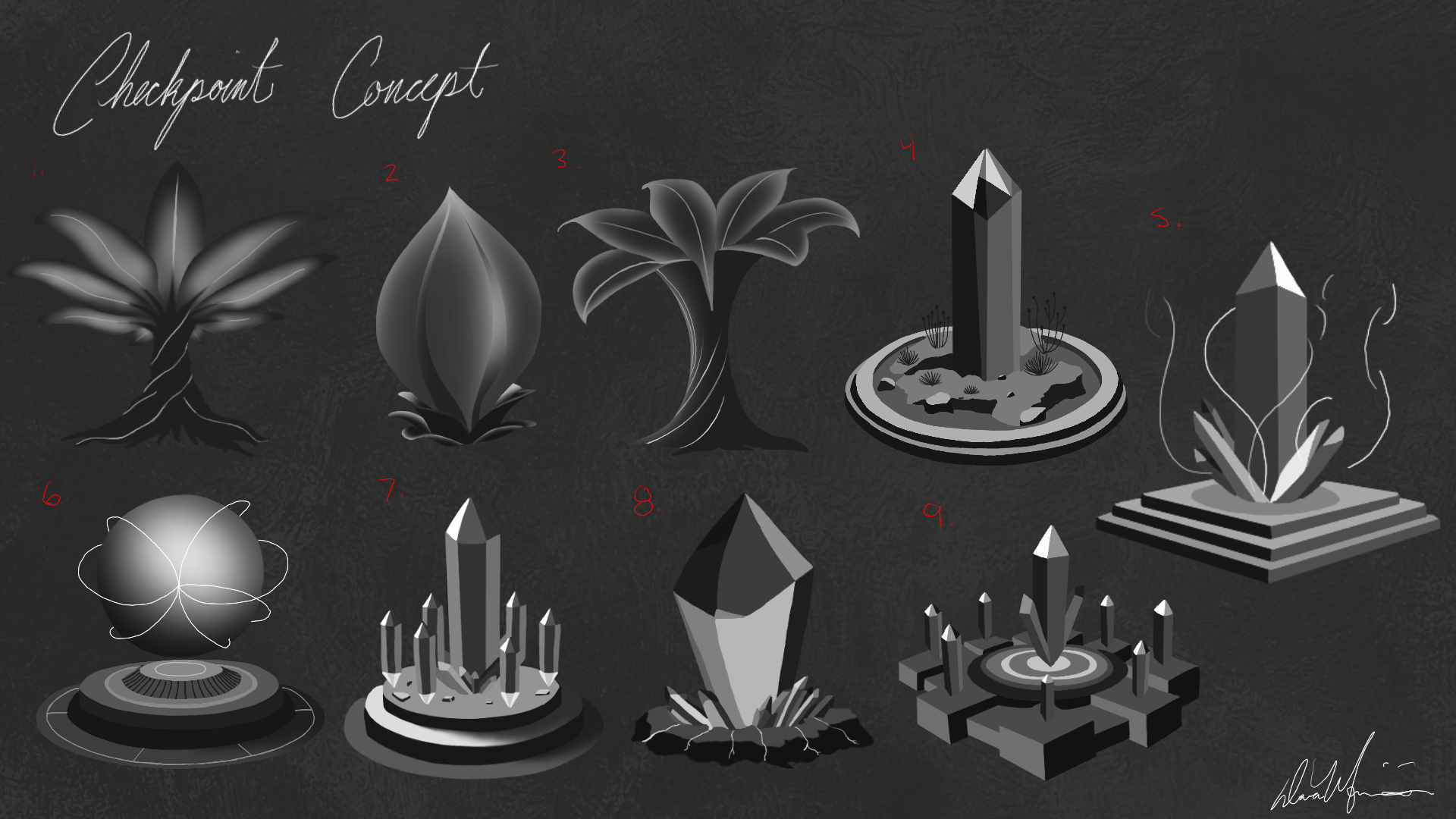 For our game, checkpoints will be placed throughout the levels. When activated these will be the player’s respawn point if they die in the game. I made the concept designs for them. The planet is covered with overgrowth and abnormal flora as well as a unique energy source. I wanted the checkpoint to relate to one of these two either a massive flora that has been mutated by the energy flowing around the planet or a crystalized version of it.